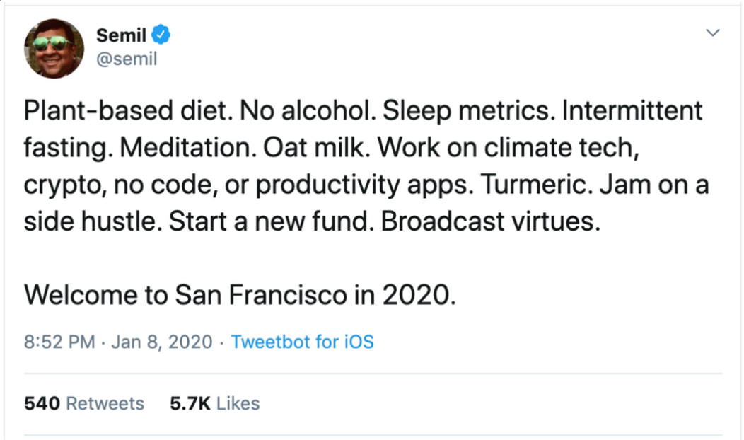 As for the tweet, it's a light jab at the classical Bay Area startup entrepreneur and the archetypal Google software engineer. If you have met anyone from the Bay Area, chances are they would have (read 'be guilty of') at least three of these qualities.